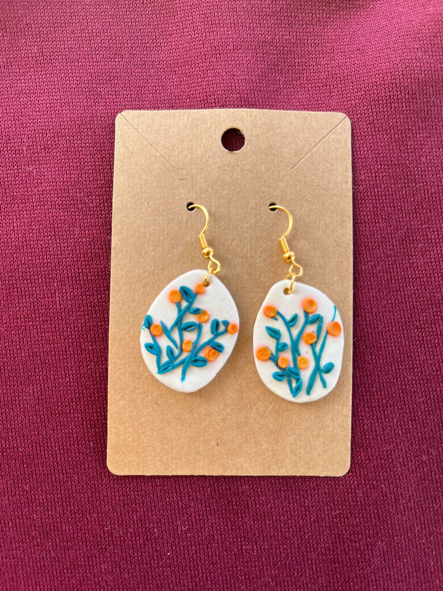 + Free ShippingSet on a smooth white oval base, this handcrafted pair of earrings showcases slender blue stems with matching leaves, dotted with small, vibrant orange flowers. The gentle interplay of colors creates a delicate, whimsical composition reminiscent of a peaceful meadow in bloom, perfect for adding a subtle yet charming accent to any ensemble.