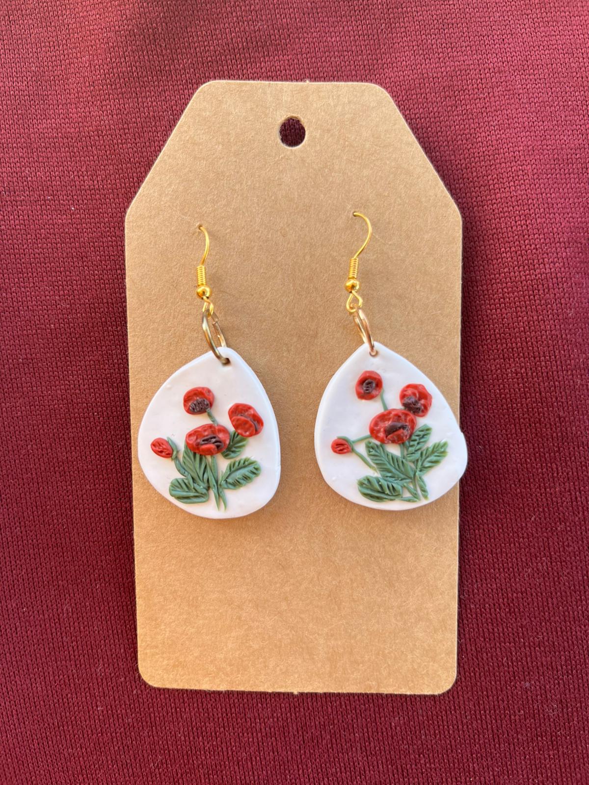 + Free ShippingHandcrafted on a smooth, pearl-white triangular base, this elegant pair of earrings showcases vivid red flowers gracefully arranged above a cluster of lush green leaves. The striking contrast between the bright crimson blossoms and the pristine base creates a bold yet refined composition, reminiscent of a serene garden in full bloom. Perfect for adding a touch of sophistication and vibrant charm to any ensemble.