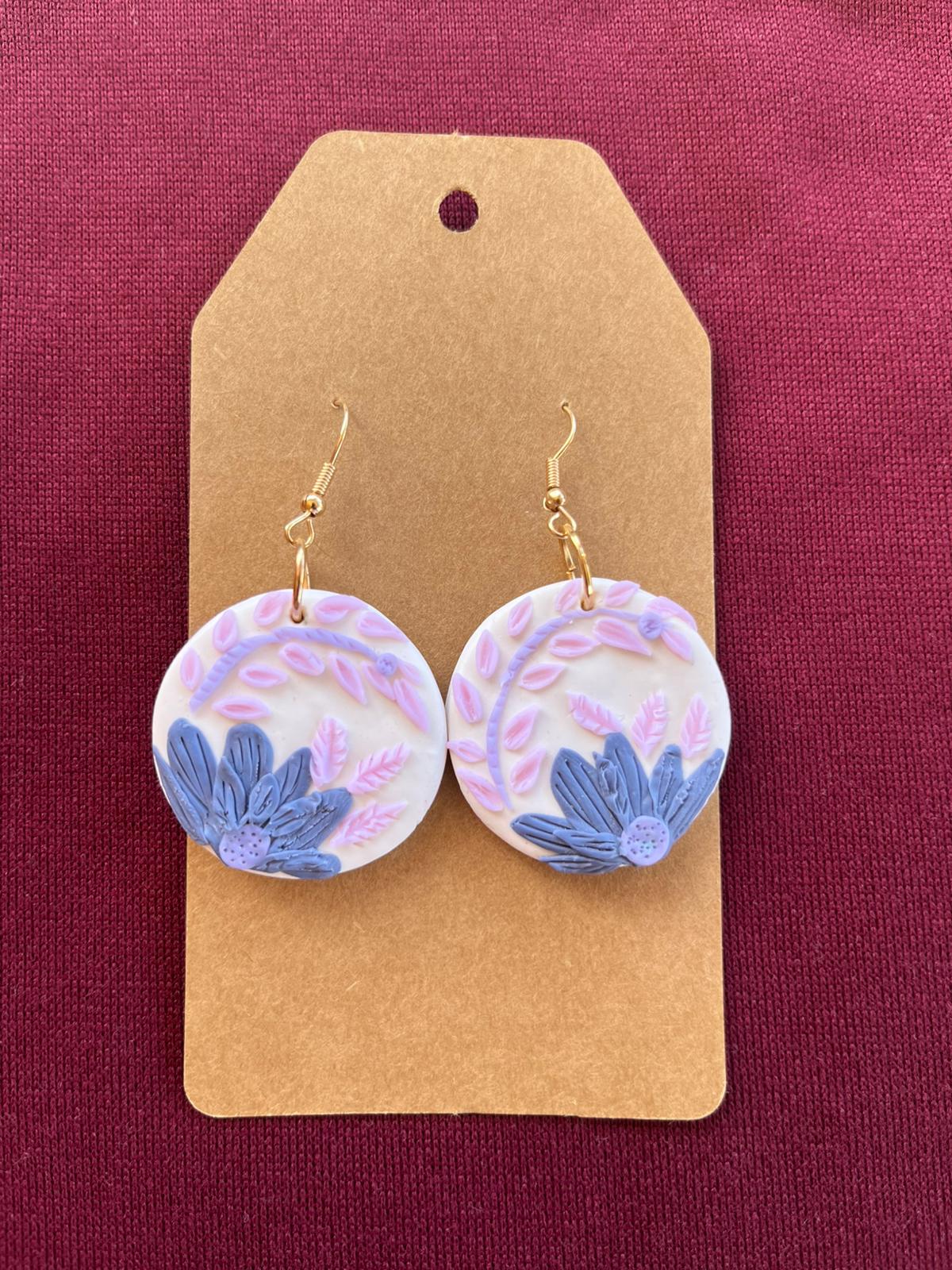 + Free ShippingA graceful pair of handcrafted earrings featuring a soft white round base adorned with delicate pink leaves and a beautifully sculpted purple flower at the center. The subtle contrast between the pastel petals and the rich violet bloom creates a serene, elegant composition reminiscent of early spring mornings. Perfect for adding a gentle, feminine charm to any outfit.
