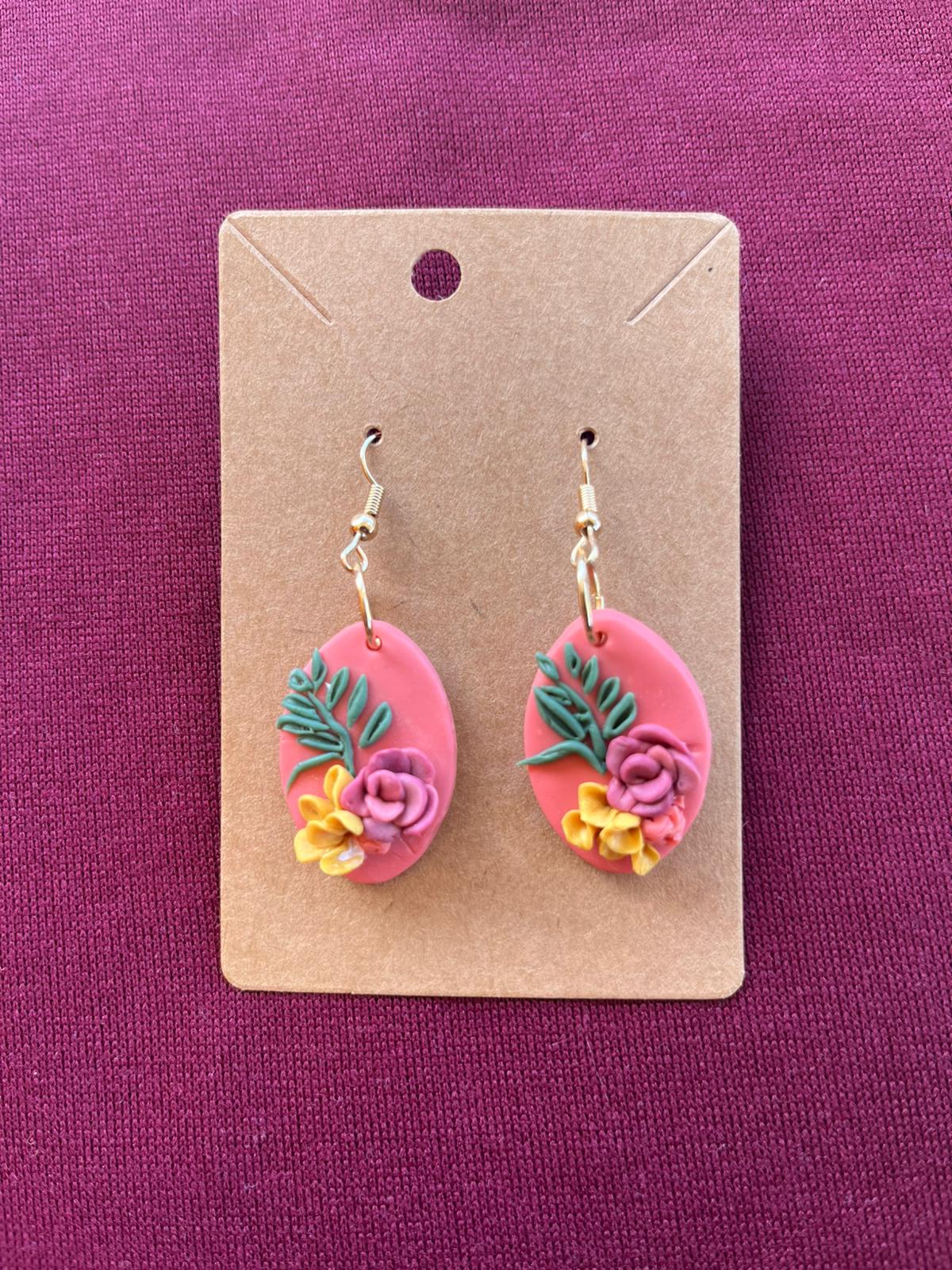 Handcrafted earrings featuring delicate roses in shades of pink and yellow, set on a warm coral base. Inspired by the golden hues of a sunset garden, these earrings bring a soft, romantic charm to any look.